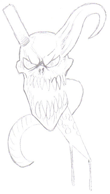 Now it's about adding in more detail, but don't go mad with details if you do intend selling the tattoo or getting it inked yourself as too much detail makes for a good drawing but a bad tattoo, as most tattoo artists will get rid of the details and make the design more fluid anyway, I add in the frown lines around the eyes on other lines to make the demon more evil with some minimal shading, also you will notice that I've drawn in a knife on the opposite side of the demons head, so that it balances the design.